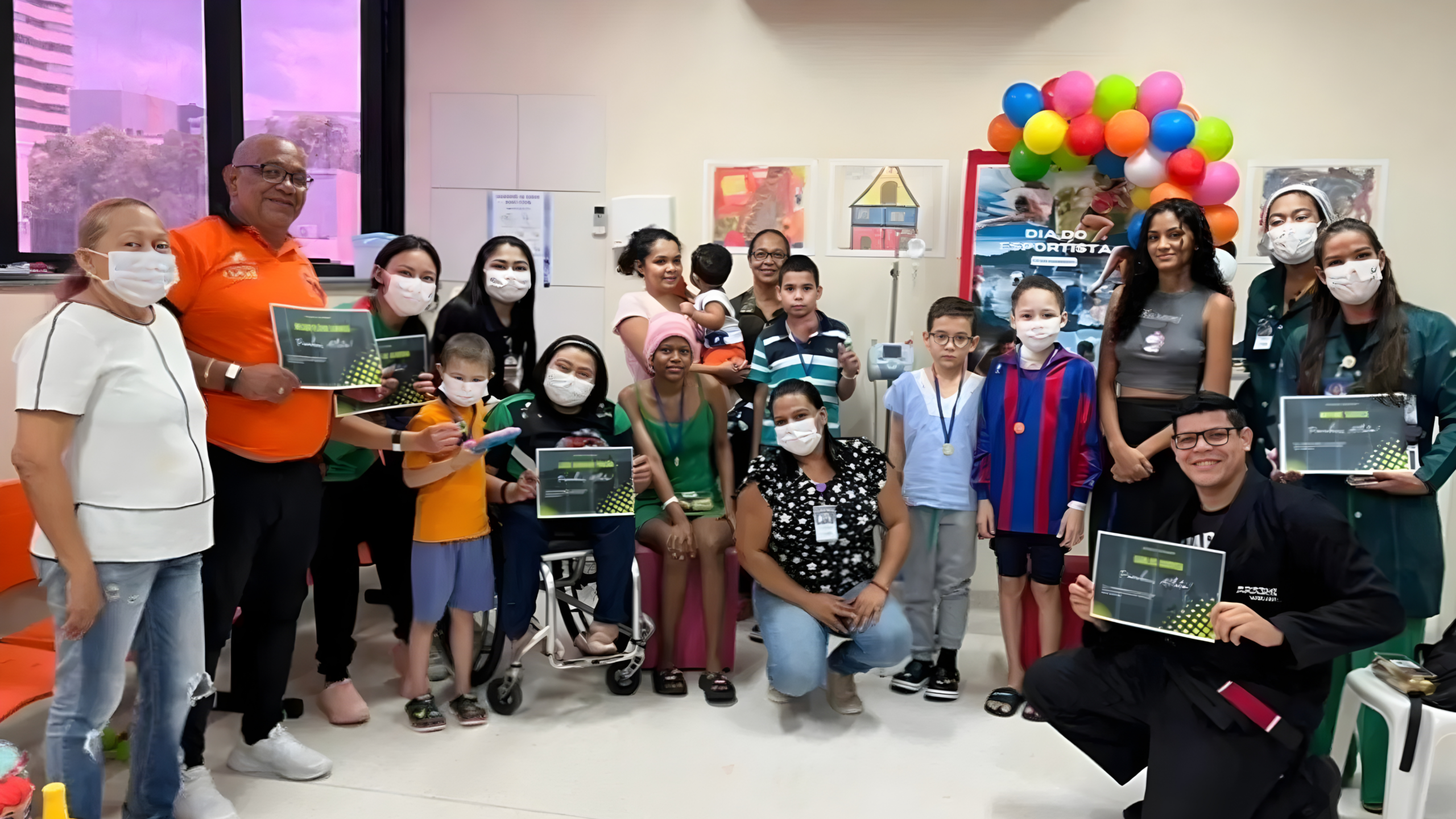 Na última quinta-feira (19), o ambiente colorido e repleto de elementos lúdicos da brinquedoteca do 2º andar do Hospital Oncológico Infantil Octávio Lobo (Hoiol), em Belém, dividiu espaço com medalhas, fotos e histórias de superação. O cenário foi montado para roda de conversa sobre inspirações esportivas, evento promovido pela equipe de Humanização da unidade e que reuniu atletas convidados, pacientes internados e acompanhantes em um encontro marcado por dicas, recomendações e muito incentivo.
