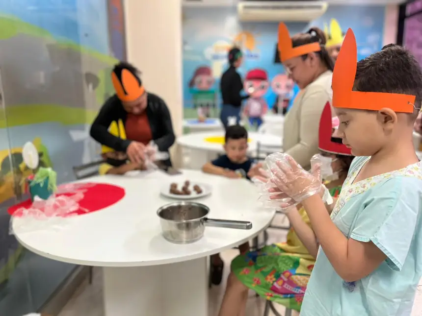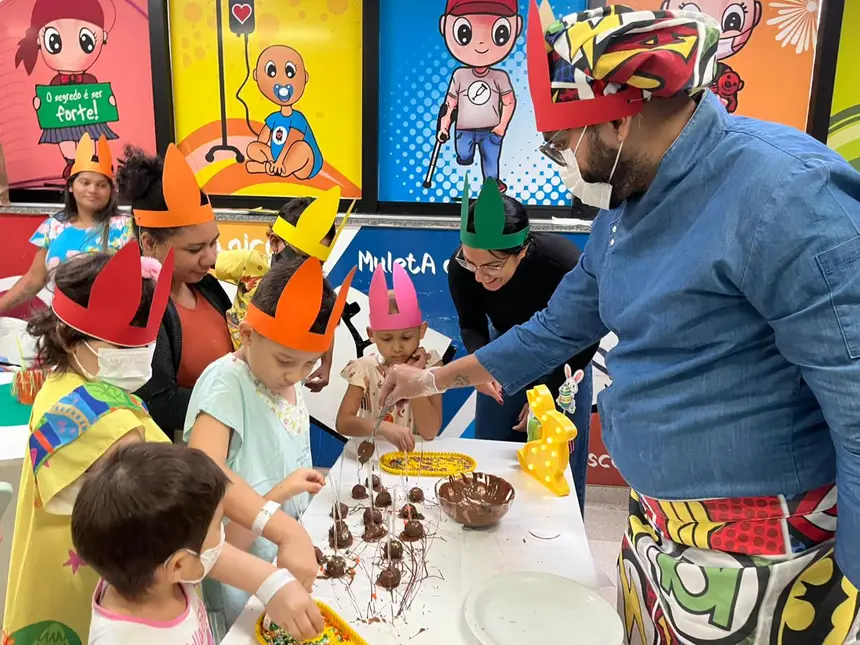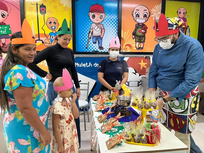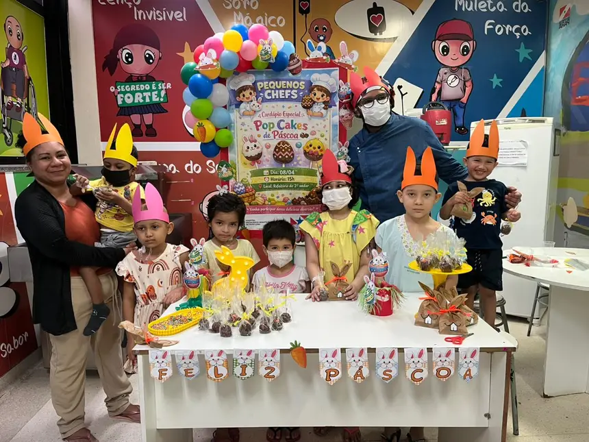 Pacientes em tratamento no Hospital Oncológico Infantil Octávio Lobo (Hoiol), em Belém, participaram na tarde desta quarta-feira (8) de uma edição especial do Projeto “Pequenos Chefs”. A atividade, alusiva à Páscoa, reuniu crianças e acompanhantes em uma experiência culinária, com preparo de popcakes, bolinhos no formato de pirulitos, receita escolhida pelo chef voluntário para estimular a interação, a criatividade e o bem-estar dos pacientes internados.